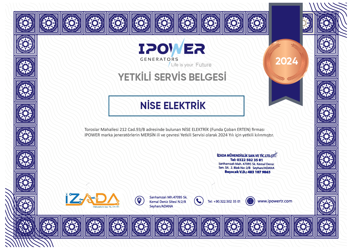 Nise Jeneratör, Jeneratörün Mersin ili ve ilçelerini kapsayan tek yetkili satıcısıdır. Satış sonrası servis işlemlerini yine Nise Jeneratör yapmaktadır